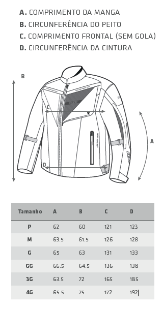 - Zonas elásticas com tecido “stretch solution” nos braços e ao longo das costelas e barriga;