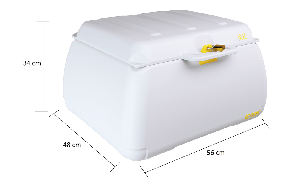 A tampa da caixa de plástico tem revestimento duplo, sem risco de amassá-los, dando assim maior resistência ao produto. Tem áreas específicas para acoplar alongadores plásticos, ideal para carregar banners e cartazes. Nos quatro cantos da tampa do baú existem pequenos furos para prender a rede e guardar o capacete. É possível personalizar a caixa plástica com a logo da empresa e/ou com a bandeira a ser acoplada. Baú para moto ICBRAS é feito no material PEAD (É um plástico atóxico e tem ótima resistência físico-química), na cor branca.